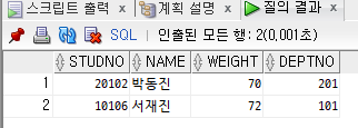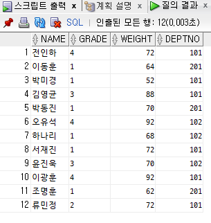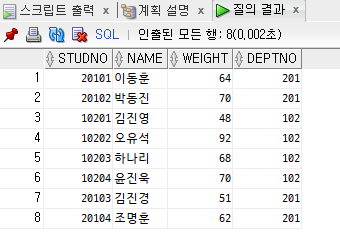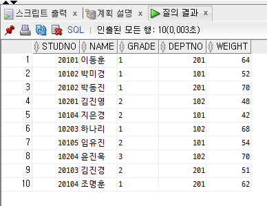 SELECT STUDNO, NAME, GRADE, DEPTNO, WEIGHT