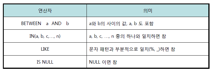 WHERE절에서 숫자, 문자, 날짜의 크기나 순서를 비교하는 연산자(BOOLEAN타입)