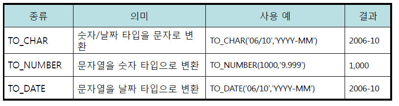 - 숫자나 날짜 타입을 문자와 함께 결합하거나 보고서 양식에 맞추기 위해 주로 사용