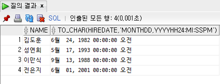 SELECT NAME, TO_CHAR(HIREDATE, 'MONTH DD, YYYY HH24:MI:SS PM')