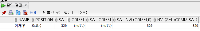 SELECT NAME, POSITION, SAL, COMM, SAL+COMM, SAL+NVL(COMM, 0), NVL(SAL+COMM, SAL)