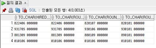, TO_CHAR(ROUND(HIREDATE, 'MM'), 'YYDDMM HH24MISS')