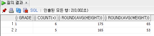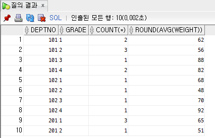 SELECT DEPTNO, GRADE, COUNT(*), ROUND(AVG(WEIGHT))