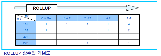 - GROUP BY 절에 칼럼의 수가 n개이면 ROLLUP 그룹핑 조합은 n+1개