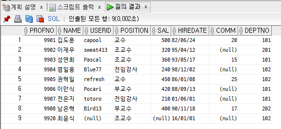 VALUES (9910, '백미선', 'white', '전임강사', 200, SYSDATE, 10, 101);