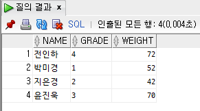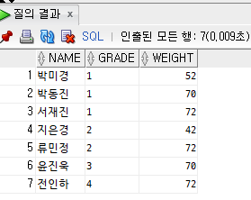 예제)PAIRWISE 비교방법에 의해 학년별로 몸무게가 최소인 학생의 이름, 학년, 몸무게를 출력
