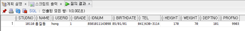VALUES(10110, '홍길동', 'hong', '1', '8501011143098', '85/01/01', '041)630-3114', 170,70,101,9903);