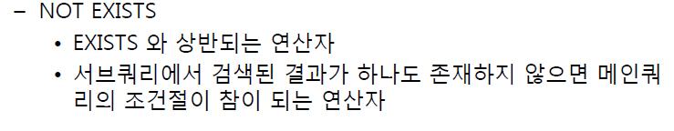 - 서브쿼레에 검색된 결과가 존재하지않으면 메인쿼리의 조건절은 거짓