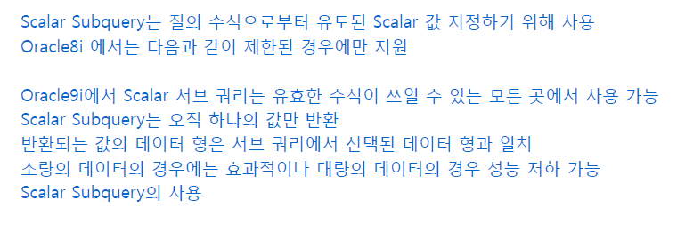 - SUBQUERY : 입력 데이터 집합을 정의하기 위한 서브쿼리