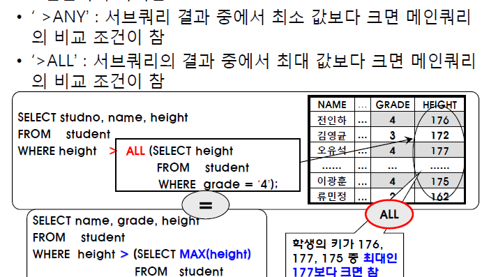 - 메인쿼리의 비교 조건에서 서브쿼리의 검색 결과와 모두 일치하면 메인쿼리 조건절이 참이되는 연산자