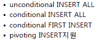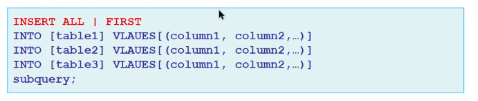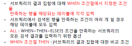 - FIRST : 서브쿼리의 결과집합을 해당하는 첫번째 INSERT절에 입력