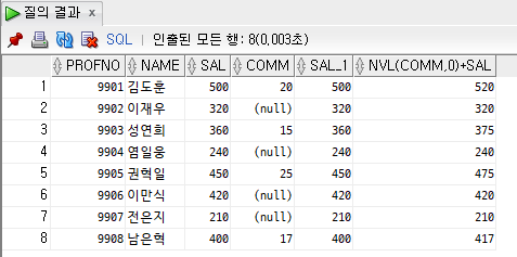 SELECT PROFNO, NAME, SAL, COMM, SAL, NVL(COMM, 0)+SAL