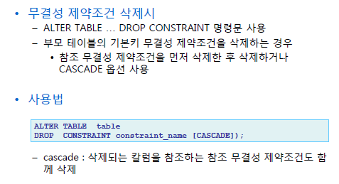 UPDATE | 참조 키 값을 참조하는 자식 테이블의 칼럼값이 없는경우에만 가능 | 수정되는 외래 키 값이 참조 키 값 중의 하나와 일치할 경우에 가능 |