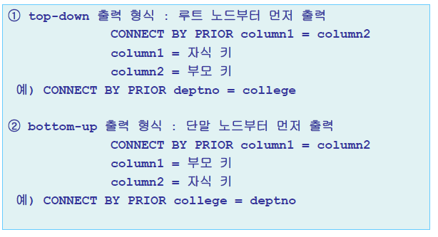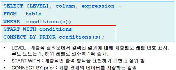 - SELECT 명령문에서 START WITH와 CONNECT BY절을 이용